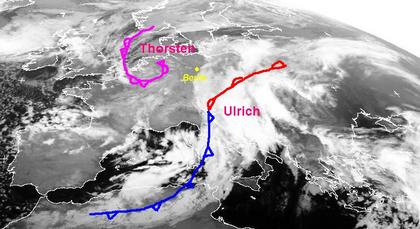 Das Tief „Thorsten“ liegt über den Niederlanden (man kann es noch an einer Wolkenspirale erkennen) und schwächt sich immer weiter ab, in Benelux und Westdeutschland bringt es immer noch Schnee oder Schneeregen. Über den Alpen hat sich das neue Tief „Ulrich“ aufgebaut, die Kaltfront des Tiefs erstreckt sich von seinem Zentrum bis nach Nordafrika. Auf der Rückseite des Tiefs haben sich mehrere Schauerwolken entwickelt, über dem Atlantik sind sie sehr gut zu erkennen.