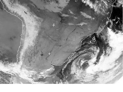 Unter Hochdruckeinfluss sind der Norden von Chile und Argentinien, sowie Paraguay und Uruguay, auf dem Satellitenbild von Dienstag früh, nahezu wolkenfrei. Der Tiefdruckwirbel über dem Südatlantik bringt kaum Wolken und Regen ans Festland. Gut zu erkennen ist dabei der Verlauf der Anden, sowie einige breite Flusstäler. (Bildquelle: NERC Satellite Receiving Station, Dundee University, Scotland, http://www.sat.dundee.ac.uk/)