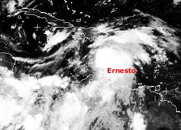 In der Karibik hat sich der tropische Sturm Ernesto entwickelt. Zurzeit beträgt seine mittlere Windgeschwindigkeit 75 km/h. Er wird sich aber weiter verstärken und morgen nach Jamaika und danach nach Kuba ziehen. Möglicherweise zieht er dann als Hurrikan in den Golf von Mexiko. (Bildquelle: NERC Satellite Receiving Station, Dundee University, Scotland, http://www.sat.dundee.ac.uk/)