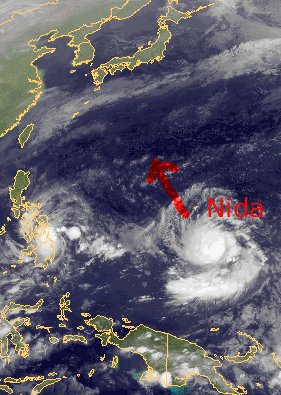 Auf dem Westpazifik hat sich der neue Tropische Wirbelsturm 'Nida' gebildet. Derzeit werden nur Böen bis 90 km/h erreicht, der Sturm wird sich jedoch weiter verstärken und voraussichtlich Taifunstatus erreichen. Er zieht langsam nach Nordosten, Landgebiete erreicht er dabei jedoch zunächst noch nicht.