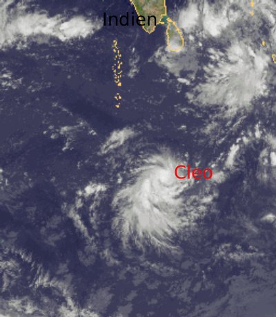 Über dem Indischen Ozean, weitab von bewohnten Küsten, liegt der neue Zyklon 'Cleo'. Er erreicht in Böen derzeit bis zu 110 km/h, wird sich aber noch weiter verstärken. Dabei zieht er allmählich nach Westen.