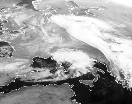 Das Tiefdrucksystem über Europa hat zwei Zentren. Während die Ausläufer von Tief 'Yannick' mit Zentrum über der Slowakei vor allem in Norddeutschland für teils kräftigen Schneefall sorgt, liegt das zweite Tief 'Zoltan' über Norditalien. Es hat sich bei der Überströmung der Alpen im 'Windschatten' hinter den Bergen gebildet.