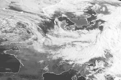 Die Kaltfront von Tief 'Mona' über Nordosteuropa hat inzwischen mit ihren Wolken die Alpen erreicht. Auf ihrer Rückseite haben sich in der kühlen Meeresluft noch viele Wolken gebildet, die über Deutschland nur langsam auflockern. Über Südskandinavien und Teilen der Nordsee ist es weniger bewölkt. Von den Britischen Inseln her nähern sich jedoch noch höhere Wolken, die Deutschland heute aber kaum erreichen werden. (Bildquelle: NERC Satellite Receiving Station, Dundee University, Scotland, http://www.sat.dundee.ac.uk/)