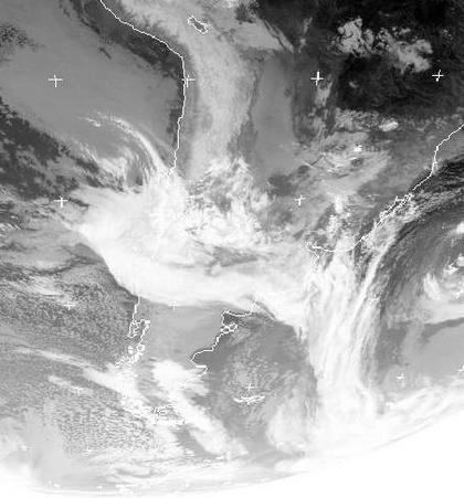 Eine Luftmassengrenze liegt mit dichten Regenwolken über der Mitte von Chile und Argentinien. Von Süden strömt dabei kalte Luft nach Norden. Ganz im Süden ziehen Schneeschauer durch.