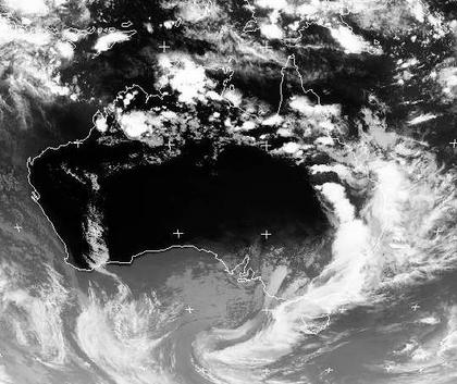 Südwestlich von Australien liegt ein Tief, dessen Kaltfront mit ihren Wolken über dem Osten des australischen Kontinents liegt. Dort kommt es zu ergiebigen Regenfällen und teils kräftigen Gewittern. im Norden des Kontinents bilden sich dagegen tropische Schauer und Gewitter.