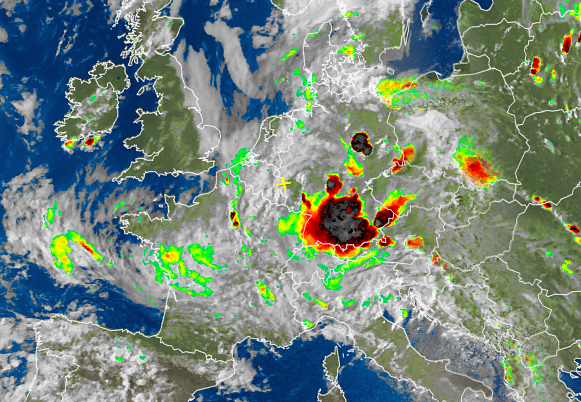 In den frühen Abendstunden erreichten die extrem feuchten Luftmassen dann den Süden von Deutschland. Vom Main bis an die Alpen und vom Schwarzwald bis an die tschechische Grenze kam es verbreitet zu sehr heftigen Unwettern mit Starkregen, Hagel und Blitzschlag. Lokal kamen dabei in kurzer Zeit mehr als 50 Millimeter Niederschlag pro Quadratmeter zusammen, sodass Bäche über die Ufer stiegen und Keller vollliefen.