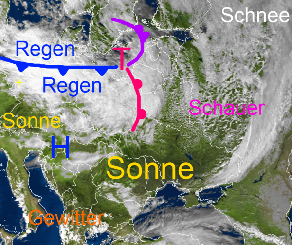 Schauerbewölkung erkennt man über Teilen Russlands. Ganz im Norden fällt sogar Schnee.