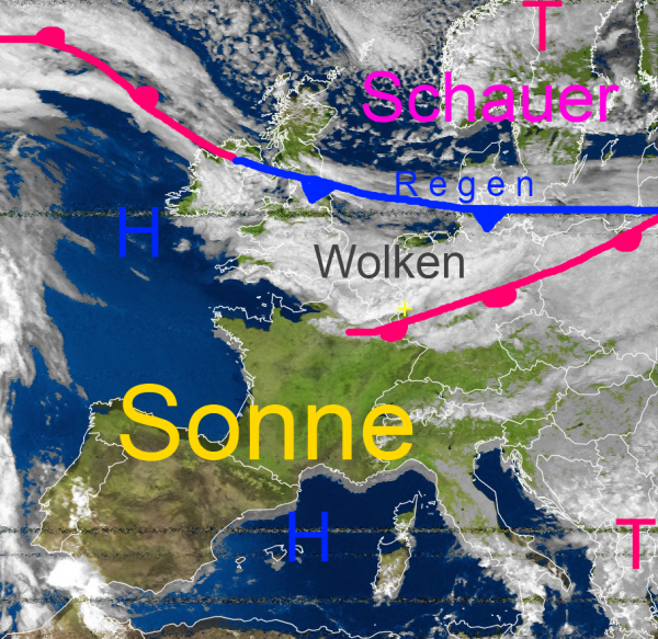 Während im Süden unseres Landes oft noch die Sonne lacht, machen sich in den anderen Gebieten Deutschlands schon die Wolken des Tiefs über Skandinavien bemerkbar. Ganz vereinzelt tröpfel oder nieselt es im Bereich der Warmfront.