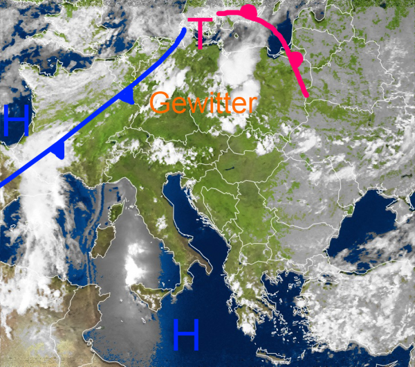Im Warmsektorbereich des Tiefs über der westlichen Ostsee haben sich wieder teils unwetterartige Gewitter gebildet, die derzeit über Teilen Deutschlands wüten und auch noch bis in die Nacht hinein andauern werden. Glücklicherweise gibt es aber auch Gebiete, die davon verschont bleiben. Mit Überqueren der Kaltfront wird die schwüle Hitze nun zumindest vorübergehend vertrieben.