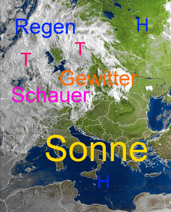 Hinter der nach Osten abziehenden Kaltfront hat sich eine Labilitätszone gebildet, in der immer wieder zum Teil kräftige Regengüsse und Gewitter entstehen können. Die Schauer treffen zwar nicht jeden mit gleicher Intensität, treten allerdings doch recht verbreitet auf.