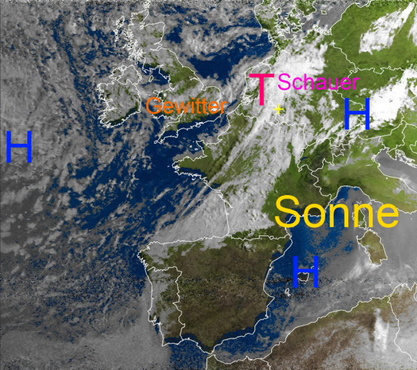 Die Störungsfront eines kleinen Tiefs über Benelux überquert Deutschland mit einigen teils kräftigen Regengüsse und einzelnen Gewittern. In Teilen NRW´s, sowie im südlichen Niedersachsen fielen dabei bisher schon zwischen 10 und 20 Liter Regen pro Quadratmeter. In Lügde-Paenbruch (östliches NRW) waren es sogar 22 Liter pro Quadratmeter.