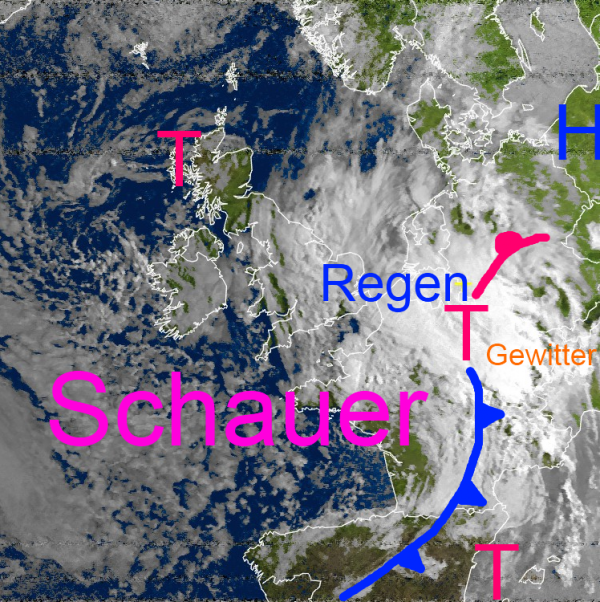 In Deutschland gibt es erneut große Temperaturkontraste zwischen dem Westen und dem Osten. Daher muss erneut mit teils kräftigen Regengüssen und Gewittern gerechnet werden. Vor allem in Süddeutschland drohen abends und nachts auch wieder örtliche Überschwemmungen. Bis Mitternacht wandert das Tief mit seinem Kern zur Deutschen Bucht.