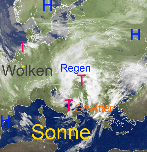 Ein kräftiger Wolkenwirbel bringt Teilen der Karpaten und des Balkans kräftigen Regen und örtliche Gewitter. Lokal kann es dabei auch zu Überschwemmungen kommen. Dieses Tief über Ungarn wander bis morgen Richtung Ägäis und bringt auch Teilen Griechenlands und der Türkei kräftige Regengüsse.