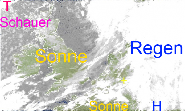 Während sich in großen Teilen Deutschlands eine zähe Wolkenpampe hält, aus der es im Norden auch gelegentlich regnet, erkennt man über Nordfrankreich und den Britischen Inseln aber auch größere Lücken mit Sonne. Hinter der nach Osten abgezogenen Warmfront hat sich aber in weiten Teilen Mitteleuropas sehr milde Luft durchgesetzt.