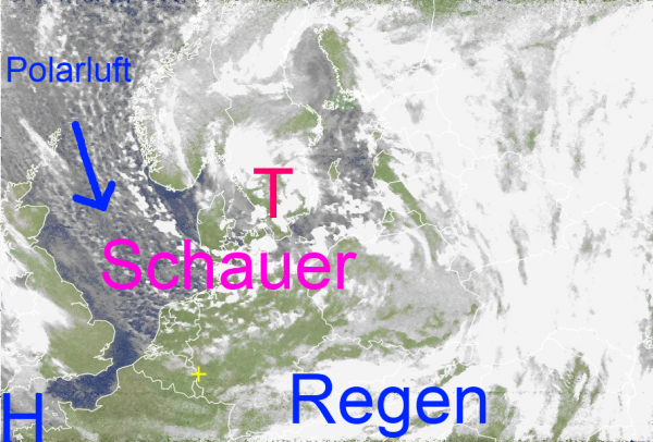In der wegen der noch milden Meere erwärmten Polarluft ziehen von Nordwesten Schauerwolken nach Deutschland. In höheren Lagen der Mittelgebirge, sowie an den Alpen kann es dabei auch schneien. In tieferen Lagen mischen sich bei stärkeren Schauern örtlich Graupelkörner unter die Tropfen.