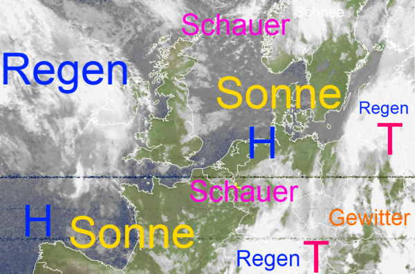 Über Osteuropa, dem Balkan und den Alpen dominieren häufig dichte Regen- und Schauerwolken. Teilweise gehen auch kräftige Gewittergüsse nieder.