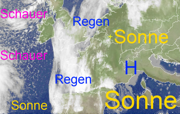 Über Mitteleuropa ist die teils zähe Wolkendecke häufig mal aufgerissen und hat der Sonne Platz gemacht. Das von Nordwestspanien, über die Biskaya bis zur Nordsee reichende Wolkenband mit Regen kommt unter Abschwächung allmählich ostwärts voran und wird im Tagesverlauf den Westen und Nordwesten unseres Landes erreichen. In der dahinter über den Atlantik streichenden etwas kälteren Luftmasse haben sich wabenförmige Schauerwolken gebildet.