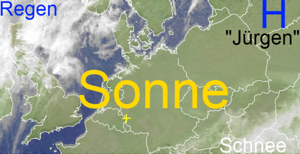 Das kräftige und nahezu ortsfeste Hoch über Weißrussland mit dem Namen "Jürgen" beschert uns zwar blauen Himmel und viel Sonnenschein von morgens bis abends. Es zeigt uns aber auch die kalte Schulter, so dass sich die Temperaturen tagsüber meist nur im einstelligen Bereich aufhalten. Nachts tritt unter sternenklaren Himmel verbreitet leichter bis mäßiger Frost auf.
