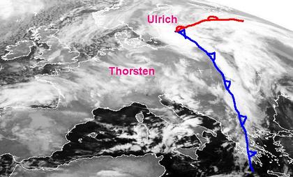 Das Tief „Ulrich liegt über dem Baltikum“, seine Kaltfront erstreckt sich vom Zentrum des Tiefs bis nach Griechenland. Das ehemalige Sturmtief „Thorsten“ über Deutschland (man kann es noch an einer Wolkenspirale erkennen) schwächt sich immer weiter ab. Auf seiner Rückseite haben sich in feucht kalter Luft mehrere Schauerwolken entwickelt, über dem Atlantik und der Nordsee sind sie sehr gut zu erkennen.
