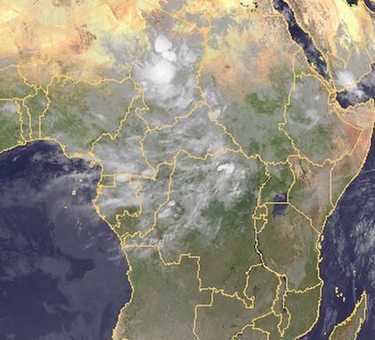 Über dem zentralen Afrika haben sich Schauer und Gewitter entwickelt. Diese entstehen jahreszeitlich bedingt. Die Zellen dieser konvektiven Systeme sind auf dem Satellitenbild gut erkennbar.