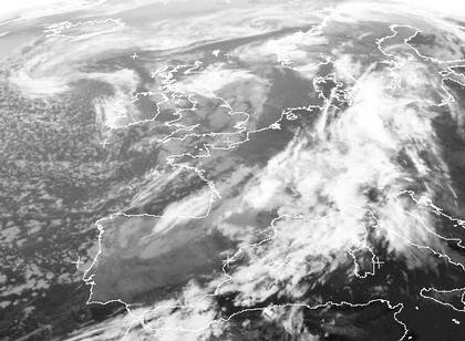 Auch wenn das Zentrum von Tief 'Ingo weit westlich von uns bei Irland liegt, hat es dennoch einen großen Einfluss auf unser Wetter. Ein Ausläufer erstreckt sich in einem weiten Bogen über Skandinavien bis nach Mitteleuropa und zum westlichen Mittelmeerraum. Er trennt schwüle-heiße subtropische Luft von einer etwas kühleren Luftmasse, die aus Westen heranströmt und sorgt für Schauer und Gewitter. Wirkliche Kaltluft ist jedoch erst in der nähe des Tiefzentrums zu finden. Man erkennt sie an den feinen Tupfenmuster der Schauerwolken westlich von Irland.