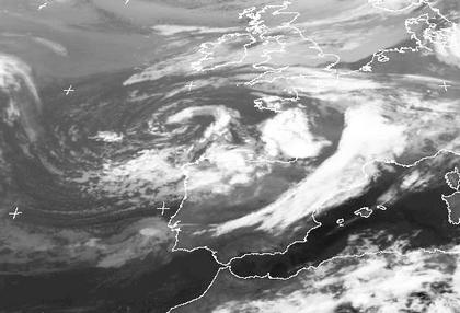 Der Ausschnitt zeigt das Tief südlich von Irland. Schön zu sehen sind die Schauerbänder westlich und südwestlich des Kerns. Sie entstehen in der kälteren Luftmasse bei relativ kräftigem Wind. In der warmen Luft östlich des Kerns entwickeln sich große Schauer- und Gewitterkomplexe.