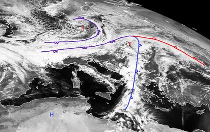 Das Tief 'Lara' mit seinem Zentrum über Ostpolen sorgt am Montag Mittag für viele Wolken über Mitteleuropa. Die Kaltfront ist dabei bis ins Mittelmeer gezogen und bringt hier häufig Schauer oder Gewitter. Über Südskandinavien hat sich das kleine Randtief 'Johanna' gebildet. Auf der Rückseite beider Teifdruckgebiete stellt sich in Mitteleuropa die Strömung auf Nord um, so dass die über der Nordsee liegende Schauerbewölkung einfließen kann. (Bildquelle: NERC Satellite Receiving Station, Dundee University, Scotland, http://www.sat.dundee.ac.uk/)