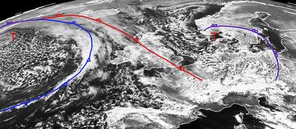 Das Schneetief 'Olinde' liegt heute Mittag über Südskandinavien. Auf seiner Rückseite strömen um das Skandinavische Gebirge herum in einer nordwestlichen Strömung zahlreiche Schneeschauer bis nach Deutschland hinein. Weiter im Westen liegt ein umfangreiches Tiefdruckgebiet mit seinem Zentrum westlich vor Island. Die Warmfront erstreckt sich dabei über die Britischen Inseln bis nach Nordfrankreich hinein. Diese Warmfront zieht bis morgen bis nach Südwestdeutschland hinein und bringt vielerorts Schnee, der durch die etwas wärmeren Temperaturen zunehmend auch in Regen übergeht. (Bildquelle: NERC Satellite Receiving Station, Dundee University, Scotland, http://www.sat.dundee.ac.uk/)