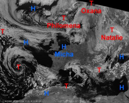 Auf dem heutigen Satellitenbild sind über weiten Teilen Mitteleuropas keine Wolken zu erkennen, hier herrscht durch Hoch 'Micha' meist sonniges und trockenes Wetter vor. Tiefdrucksysteme sorgen dagegen sowohl im Norden als auch im Osten Europas für teils dichte Wolken und einzelne Schauer, dazwischen aber auch für etwas Sonne. Auch über der Iberischen Halbinsel, Italien und in Griechenland bringen Tiefdruckgebiete einzelne Schauer, sonst ist es am Mittelmeer aber überwiegend freundlich und meist trocken.