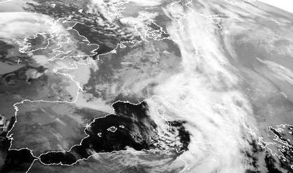 Die Kaltfront des Sturmtiefs 'Hans' hat gestern Westeuropa überquert und liegt zurzeit über dem Baltikum, Polen und Österreich, wo sie mit dem Frontensystem des Mittelmeertiefs 'Josef' verbunden ist. Hinter der Kaltfront ist hochreichende Meersluft eingeflossen, in der sich Schauer entwickeln, besonders gut sind sie über der Nordsee zu erkennen. Vom Atlantik her nähert sich bereits das neue Sturmtief 'Ingo' mit seinen Regenwolken; im Laufe des Tages zieht seine Warmfront über die Britischen Inseln hinweg und wird bei uns morgen erwartet.