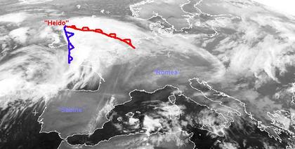 Vor der nordafrikanischen Mittelmeerküste sind noch einige Gewitterzellen zu erkennen, sonst sorgen die beiden Hochs 'Romea' und 'Sabine' für einen fast wolkenfreien von Portugal bis Tschechien. Die Britischen Inseln liegen dagegen unter einer dichten Wolkendecke. Diese Wolken gehören zu dem Sturmtief 'Heido' mit seinem Kern über Irland. Im Laufe des Tages wird es sich weiter Richtung Norwegen verlagern und in West- und Norddeutschland teils kräftigen Regen und Wind bringen.