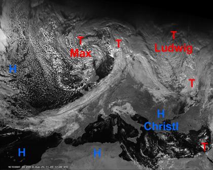 Auf dem Satellitenbild von heute Nachmittag zeigt sich, dass das Sturmtief 'Max' über dem nördlichen Großbritanien mit seinen Ausläufern dichte Wolken und Schauer von Portugal, über den Norden Spanien, den Nordwesten Frankreichs, über Großbritanien bis weiter nach Skandinavien bringt. Ein weiteres Tiefdruckgebiet sorgt über Osteuropa für vielfach trübes und teils nasses Wetter. In Teilen Mitteleuropas und vor allem im gesamten Mittelmeerraum ist es hingegen sehr freundlich bei meist nur geringem oder wolkenlosem Himmel. im östlichen Mittelmeer bringt allerdings ein Tief gebietsweise Schauer oder Gewitter.