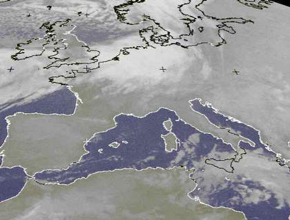Ein Wolkenband erstreckt sich auf dem Satellitenbild vom Donnerstagmorgen von Skandinavien über Benelux und Deutschland bis nach England. Er gehört dem Frontensystem des Sturmtiefs 'Sven' mit Zentrum über dem Polarmeer. Südlich und östlich von der Regenfront sorgt das Hoch 'Ayaan' für noch einen sonnigen Tag. Über dem östlichen Mittelmeer sind Schauerwolken zu erkennen, sie entwickeln sich unter dem Einfluss des kleinen Tiefs 'Rolf' bei Zypern.