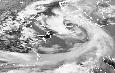 Auf dem Satellitenbild von Freitag früh ist das Sturmtief 'Thorsten' über den Niederlanden gut zu erkennen. Seine Fronten erstrecken sich von Südnorwegen über Dänemark, Deutschland und Südfrankreich bis nach Spanien und sorgen heute für zum Teil kräftigen Schnee oder Schneeregen. Auf der Westseite des Tiefs bilden sich in der heranziehenden kalten Luftmasse, vor allem über dem Atlantik, örtlich Schauer.