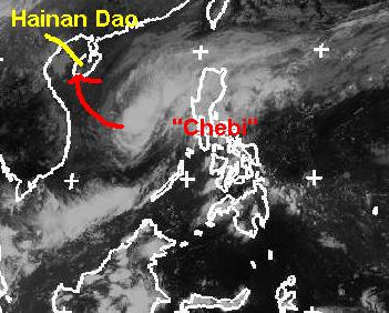 Der Taifun 'Chebi' hat die nördlichen Philippinen überquert, und befindet sich jetzt im südchinesischen Meer. Zur Zeit erreicht er mittlere Windgeschwindigkeiten von 140, im Böen 166 km/h, und soll sich noch etwas abschwächen. Berechnungen zufolge soll er am Mittwoch die chinesische Insel Hainan Dao erreichen. (Bildquelle: NERC Satellite Receiving Station, Dundee University, Scotland, http://www.sat.dundee.ac.uk/)