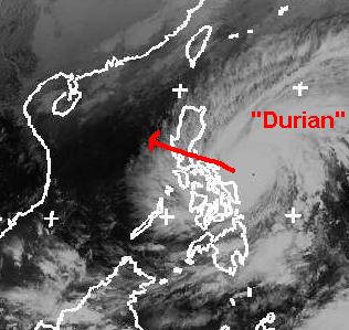 Östlich der Philippinen hat sich der tropische Sturm 'Durian' zum Taifun verstärkt. Zurzeit erreicht er mittlere Windgeschwindigkeiten von 166, in Böen 203 km/h. Berechnungen zufolge soll er weiter westwärts ziehen und voraussichtlich am Donnerstag die nördlichen Philippinen erreichen. (Bildquelle: NERC Satellite Receiving Station, Dundee University, Scotland, http://www.sat.dundee.ac.uk/)
