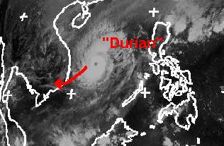 Über dem Südchinesischen Meer liegt der Taifun 'Durian'. Zurzeit erreicht er mittlere Windgeschwindigkeiten von 166, in Böen 203 km/h. Berechnungen zufolge soll er weiter westwärts ziehen und am Montag leicht abgeschwächt auf Südvietnam nahe Nha Trang treffen. (Bildquelle: NERC Satellite Receiving Station, Dundee University, Scotland, http://www.sat.dundee.ac.uk/)