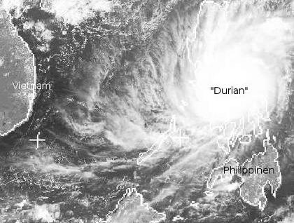 Der Taifun 'Durian' wütet derzeit über den Philippinen mit Windgeschwindigkeiten in Böen bis zu 310 km/h. Hinzu kommen ergiebige Regenmengen, die Erdrutsche auslösen können. Der Taifun zieht nun langsam weiter in das Südchinesische Meer und schwächt sich dabei etwas ab.