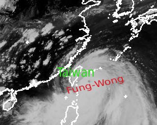 Auf dem Satelittenfoto erkennt man klar das Auge des Taifuns 'Fung-Wong'. Sein Zentrum liegt nur noch wenige 100 Kilometer östlich von Taiwan. Zur Zeit erreicht er Spitzenböen um 200 km/h, im Mittel sind es immer noch um 160 km/h. Voraussichtlich Morgen Früh erreicht er auf dem Weg nach Nordwesten die Küsten Taiwans und wird sich anschließend leicht abschwächen. Auf der Insel selbst sind ab Morgen Windgeschwindigkeiten um 120 km/h und Böen bis zu 190 km/h zu erwarten.