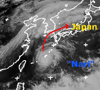 Der mittlerweile zu einem Taifun verstärkte Tropensturm 'Nari' befindet sich am Freitag morgen über den Nansei-Inseln südlich von Japan. Die mittleren Windgeschwindigkeiten liegen bei 175, in Böen bis 215 km/h. Seine weitere Zugbahn verläuft nun wahrscheinlich zunächst in nördliche Richtung auf die koreanische Halbinsel zu und dann in einer nordöstliche Richtung am nördlichen Japan vorbei. Insbesondere im südlichen Japan erreicht der Taifun dabei voraussichtlich seine höchste Energie. (Bildquelle: NERC Satellite Receiving Station, Dundee University, Scotland, http://www.sat.dundee.ac.uk/)