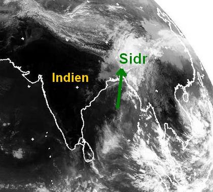 Taifun „Sidr“ hat gestern Abend die Küste von Bangladesch mit mittleren Windgeschwindigkeiten von 220 km/h, in Böen bis zu 300 km/h die Küste von Bangladesch erreicht. Unter Abschwächung verlagert er sich ins Landesinnere, dabei drohen aber weiterhin kräftige Niederschläge mit danachfolgenden Überflutungen. (Bildquelle: NERC Satellite Receiving Station, Dundee University, Scotland, http://www.sat.dundee.ac.uk/)