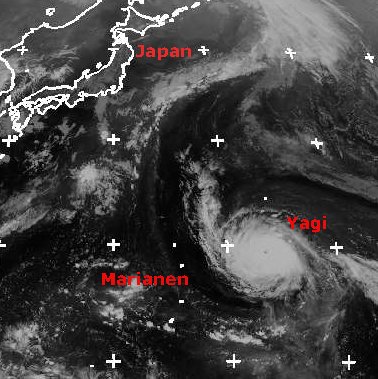 Östlich der Nördlichen Marianen liegt der Taifun 'Yagi' mit mittleren Windgeschwindigkeiten bei 225 km/h und Böen bis 275 km/h. Er zieht weiter nordostwärts, ist aber voraussichtlich nur für wenige kleine Inseln eine Bedrohung, nicht jedoch für die japanischen Hauptinseln. (Bildquelle: NERC Satellite Receiving Station, Dundee University, Scotland, http://www.sat.dundee.ac.uk/)