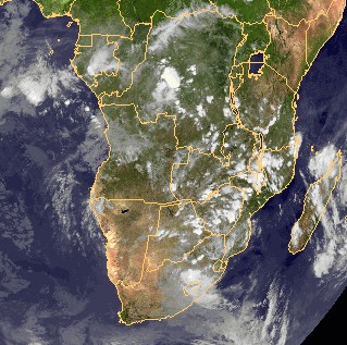 Auf dem Satellitenfoto vom südlichen Afrika sind vor allem in der Osthälfte häufig kräftige Wolkenclusterungen zu beobachten. In diesen Zonen entwickeln sich zum Teil kräftige Schauer oder Gewitter.