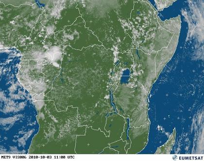 Das heutige Satellitenfoto zeigt vor allem in Äquatornähe zum Teil einige dichte Wolken, die hier zu teils kräftigen Schauern oder Gewittern führen. Sonst ist es in Zentralafrika und auch im südlichen Afrika überwiegend heiter und trocken.