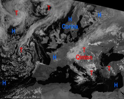 Auf dem heutigen Satellitenbild zeigt sich das kräftige Tief 'Qinton' über Osteuropa. Es sorgt mit seinen Ausläufern von Südostdeutschland bis an die Ägäis und bis in den Westen Russlands für gebietsweise kräftige Schauer oder Gewitter. In den anderen Gebieten sorgt Hochdruckeinfluss für überwiegend freundliches und trockenes Wetter.