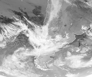 Viele Teile des Südens von Südamerika sind nur gering bewölkt oder wolkenfrei. Im Südwesten, vor der chilenischen Küste liegt aber ein Tief, dessen Wolken an die Anden des mittleren Chile ziehen. Hier kommt es zu teils sehr kräftigen Regenfällen, in den Bergen zu Schneefällen. (Bildquelle: NERC Satellite Receiving Station, Dundee University, Scotland, http://www.sat.dundee.ac.uk/)