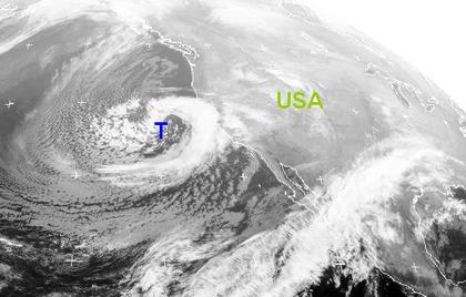 Der Ausschnitt zeigt ein Tief über dem östlichen Pazifik nahe der kalifornischen Küste (man erkennt es an einer Wolkenspirale). Heute und in den nächsten Tagen bringt das Tief teils ergiebigen Regen entlang der Westküste der USA. (Bildquelle: NERC Satellite Receiving Station, Dundee University, Scotland, http://www.sat.dundee.ac.uk/)
