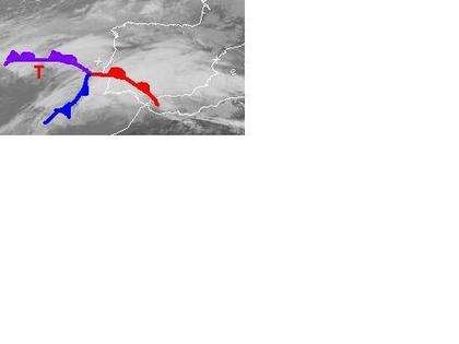 Die dichten Wolken über der Iberischen Halbinsel gehören zu einem Tief westlich von Portugal. Auf dem Satellitenbild von Dienstag Mittag hat die Warmfront bereits den Südosten erreicht und sorgt für Regen. Gegen Abend folgt die Kaltfront mit Schauer, dazu wird es teils windig. (copyright 2008 EUMETSAT)
