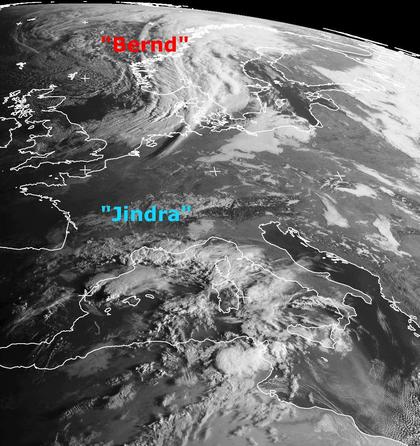 Am Freitag morgen liegen die Wolken von Tief 'Bernd' über Skandinavien. Ein schmales Wolkenband mit hohen Wolken hat dabei auch schon das norddeutsche Tiefland erreicht. An dem Schattenwurf lässt sich sehen, dass es sich um hohen Wolken handelt. Diese Wolken gehören zur ehemaligen Warmfront von 'Bernd'. Über der Nordsee liegen kompaktere Wolkenfelder, die zur Kaltfront von 'Bernd' gehören und heute mit etwas Regen und kalter Luft nach Deutschland hereinziehen. Schwacher Tiefdruckeinfluss sorgt auch am westlichen Mittelmeer für unbeständiges Wetter, ansonsten bringt Hoch 'Jindra' in weiten Teilen Mitteleuropas aber auch den 'Altweibersommer'. (Bildquelle: NERC Satellite Receiving Station, Dundee University, Scotland, http://www.sat.dundee.ac.uk/)