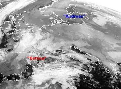 Die dichten Wolken über Frankreich und dem Mittelmeer gehören zu dem Tief 'Bettina' mit seinem Zentrum über Ostspanien. Es sorgt heute noch für Regen von Frankreich bis nach Marokko und Nordalgerien, im hohen Atlasgebirge kann es sogar schneien. In weiten Teilen Mittel-, Ost- und Nordeuropas bleibt das Hoch 'Andreas' mit Zentrum über Skandinavien und Nordwestrussland weiterhin wetterbestimmend mit kalter Luft, neben Nebel und Hochnebel, hier und da kann es aber auch auflockern.